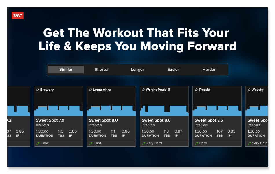 Most training derailments do not happen because you “quit.” They happen because the barriers to get on the bike stack up and if a workout doesn’t fit your schedule, it’s just easier to drop it. Workout Alternates is designed to help make training fit you and your life. Giving you clear options that keep you moving forward by making it easy to choose a workout you can complete today that supports your plan & goals.
