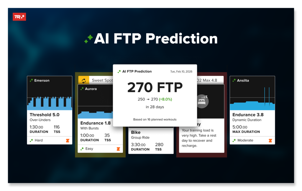 TrainerRoad AI re-simulates, predicts the effort, adjusts the coming week, and updates your projected FTP. You keep the fun and the fitness.