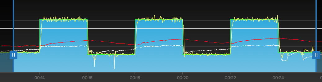 I did all of the workout in the big ring except for the second interval where I tried the little ring. Like OP, there’s a difference in staying on target; unlike him, it’s the little ring that’s struggling! I clearly remember exactly what you see here in the second interval – the power staying consistently below target until the very end of the 2-min interval. I shifted back up and stayed in the big ring for the remainder of the workout. The big ring intervals were better, with an opposite tendency – a spike that later settled down. [Standard practice for erg is to come into the work interval at the cadence you want to use, but if I do that, power actually drops at the beginning of the interval and takes 10-20 seconds to get back up, so I took advice I got in the forum and now wait until the resistance kicks in and then I try to scale up with it – hence the cadence line here.]
