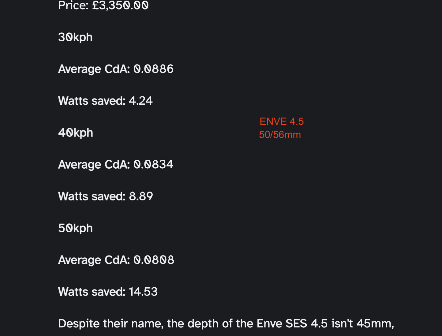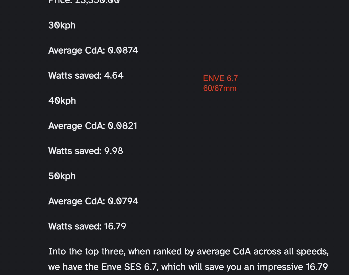 Interesting. The Cycling News aero test had them (Reserve) behind a lot of other big brands. The ENVE 6.7 were the third fastest behind the much more expensive Syncros Capital SL and the Scope Artech 6.A, both almost double the cost of ENVE. The Reserve did test pretty well at 30kph, but fell off at higher speeds. Most races I do are well above 30kph. At 40kph, the ENVE 4.5 were about .5W faster. And the 6.7 were around 1.5W faster. So not a huge amount by any means. The Scope Artech wheels tested crazy fast and they’re the lightest also. But they’re also like $4500 USD a pair.