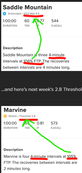 There is a clear progression, despite this week’s being labeled vo2max and next week’s labeled threshold. Point being, looking at labels and workout levels can be misleading particularly in the case of zone edges. Look past that to the underlying work.
