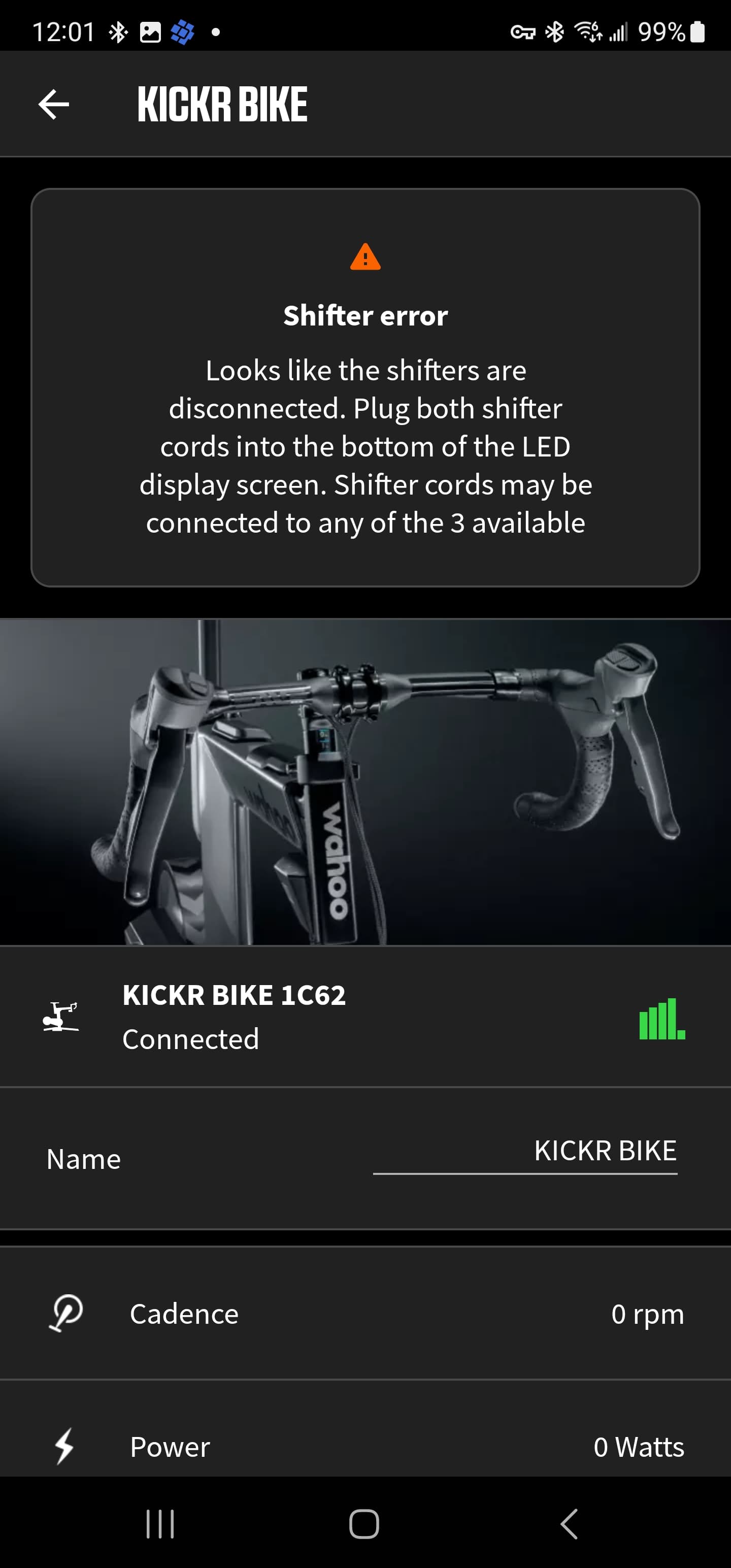 Everything was fine and I completed Wahoo SYSTM Nine Hammers using a combination of ERG and Resistance mode. I then did a few TR workouts in ERG mode and noticed I couldn’t adjust tilt. I figured it was some glitch with TR, so paused, turned the bike on and off, but no luck.