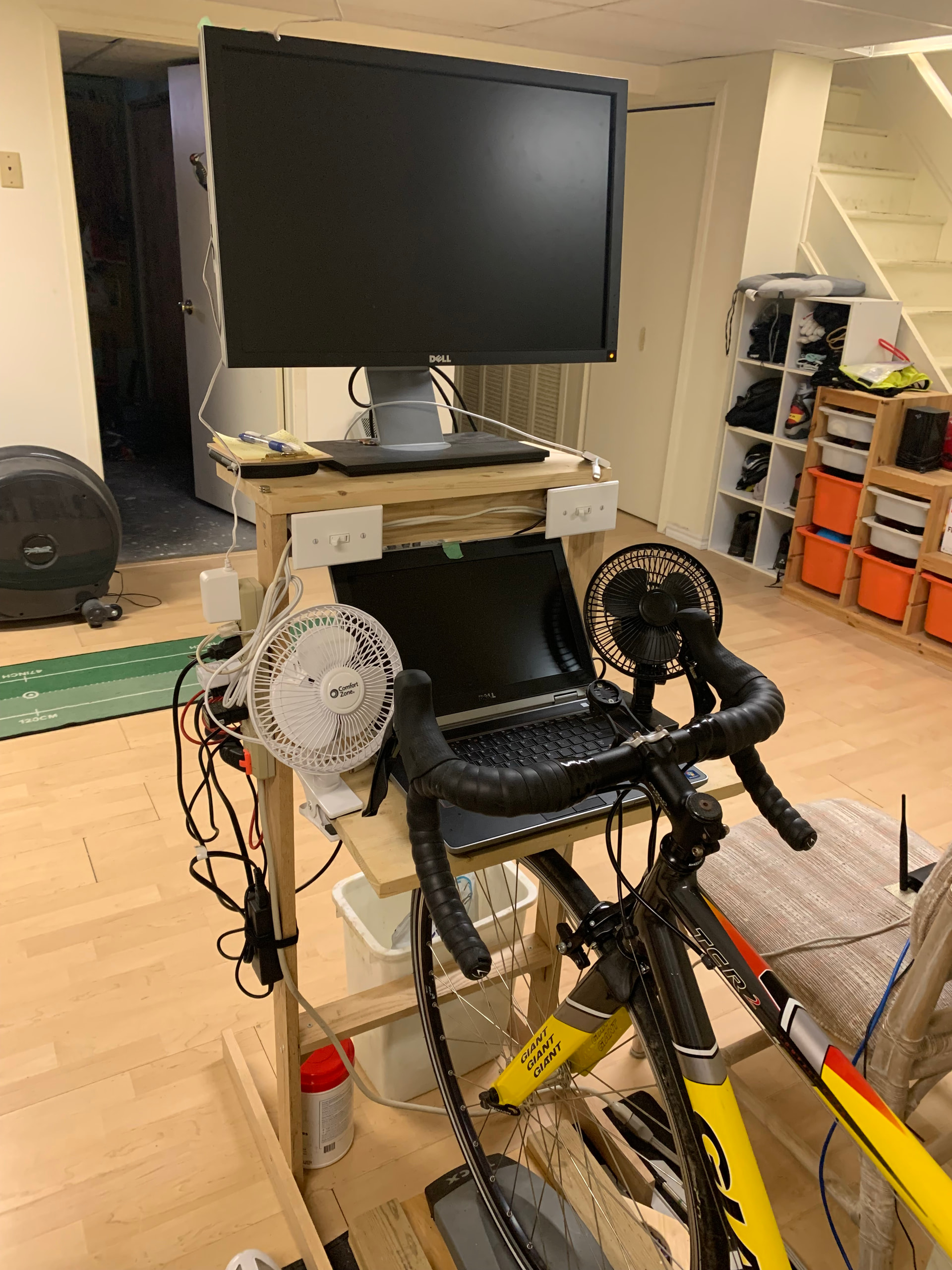 If you do a bit of digging you can find an off-brand desk equivalent to the Rad Cycles, or Wahoo model for less than $100. I picked this one up a while and it works like a charm: cup holders, slots for phone or tablet, hight adjustable to easily roll over bars, yada, yada.
