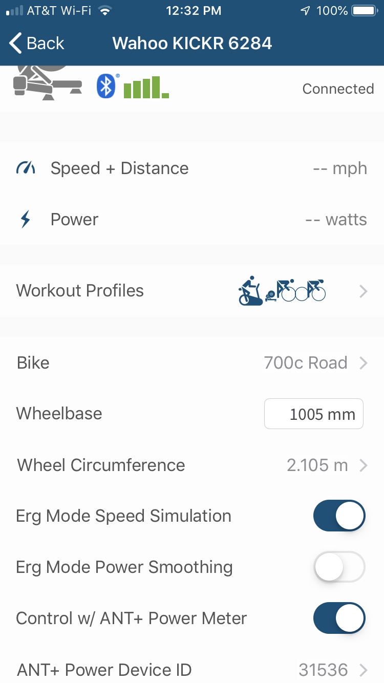 In Wahoo Fitness app, start a workout with your Kickr selected as power source. Click the symbol in upper left of screenshot above, and verify you see the “Control w/ ANT+” icon - its the “lightning bolt inside two circulating arrows.” In this screenshot, the “Control w/ ANT+” icon is to the left of the hammer/wrench icon.