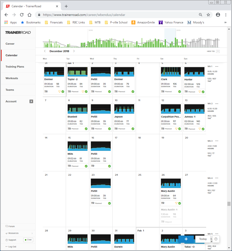 Training was pretty consistent through mid-January, until I wen on a ski trip that took me off the bike 6 days and left me very sore. Did a Petitt to try and ease back in, and 3 days later tried Mary Austin–cleared the 1st interval set, but was done and spun out for the rest of the hour at a Z2 intensity. Took two days off to try and recovery, and jumped back into a repeat of week 4 in an attempt to build back up to Mary Austin. Mary Austin was another failure on Saturday at the 1/2 way point, but Tallac +3 went fine and then some on Sunday.
