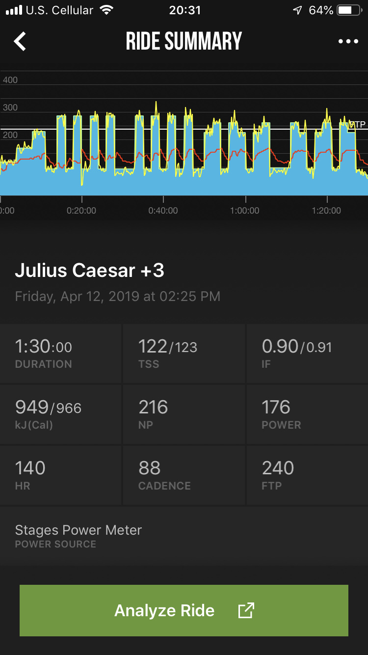 Did Julius Cesear +3 this afternoon. Felt amazing the whole way through. Didn’t feel like the 0.91 IF and stayed in TT position the entire time. It’s been 5 weeks since my last test so may be time to bump the FTP up a few. Knew I had more in me so I finished the final Under above threshold. The 95% under actually felt as though I was recovering without that gut wrenching time at the start. Maybe this was because the intervals were short but it was following VO2max intervals.