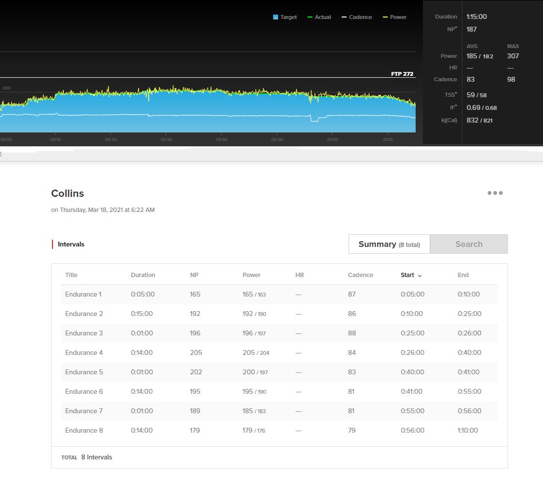 I had some trepidations heading into this one. It’s been a while since I last did O/U’s but it wasn’t pretty. This one was tough but doable (RPE 3 or 4 on a 1-5 scale if I were part of the AT beta … but alas I am not). Once I realized that the 95% is just 1% above sweet spot and that the peaks are a quick up / down, I got my head into a good space and knocked it out. Happy this one is done.