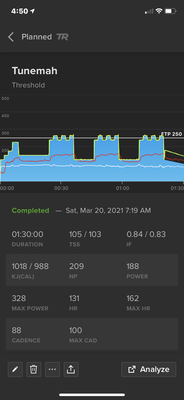 Quite happy to do this on a newly tested FTP. My HR was lower than I would have thought for the first half or so but later it drifted up a bit. Riding at <50% at the end was agony on my soft bits so I had to go in resistance mode and go a little harder (or a lot).