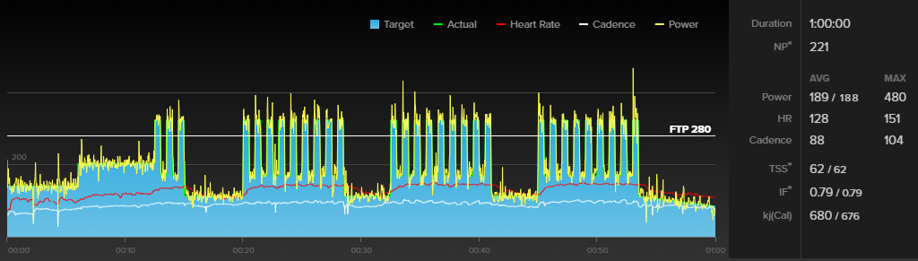 30/30s today. Haven’t done these in forever. My HR didn’t really do much in the way of “VO2max” but the goal of this workout was more to work on fast cadence and higher wattages. These workouts play really easy for me because of my previous past as a 100/200m sprinter. I’ve been doing so much steady state stuff that I’ve gotten a bit stale in those realms. When I’m doing endurance/tempo rides inside, I’m often simultaneously working on my computer, so my cadence ends up being in the low 80s.