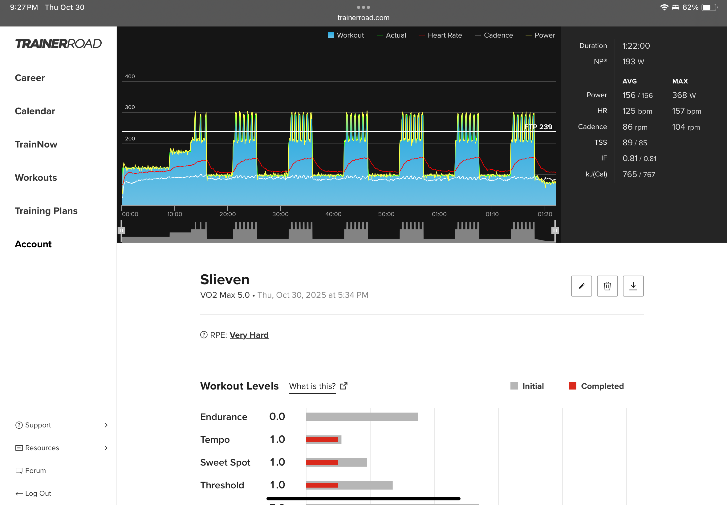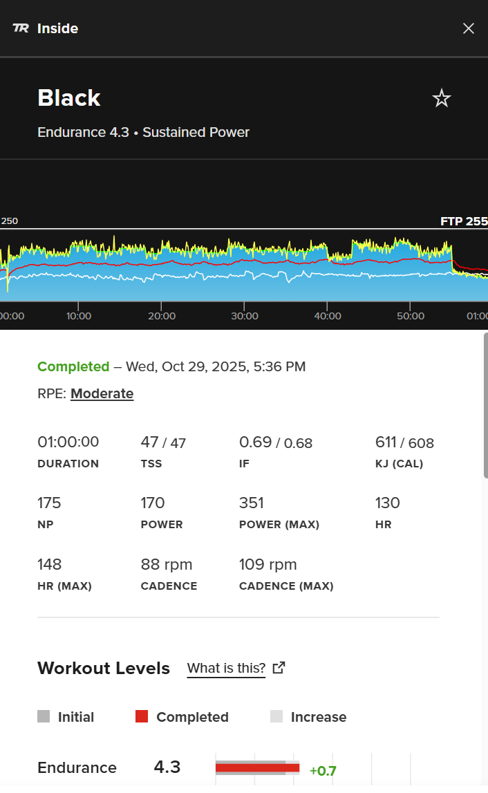 I rated it Very Hard, but because it’s been 30 days, TR wanted to raise my FTP by 3 watts. I said Hell No! and kept it at my existing FTP level. Let a poor guy at least suffer through a month of threshold before trying to up my FTP.