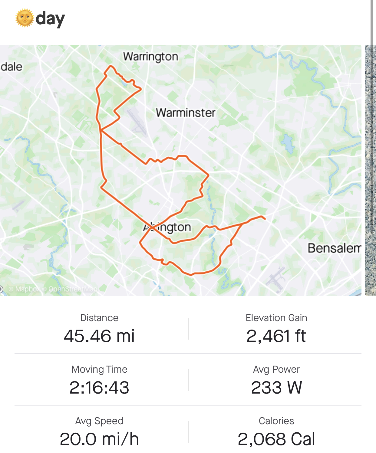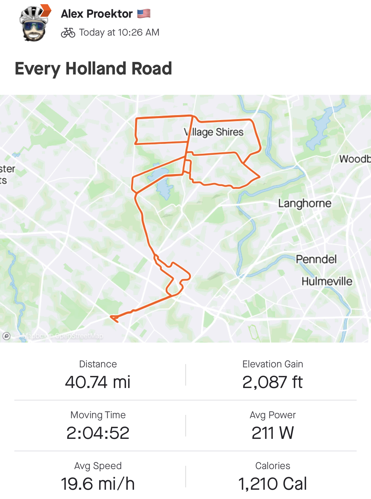 Fun ride today, perfect weather in the 70s and a 10mph wind from the north made the first leg interesting. Tempo pace with a few segment efforts, 10 top 10s but no crowns for me today. Pic was taken at the northern most point before I headed back