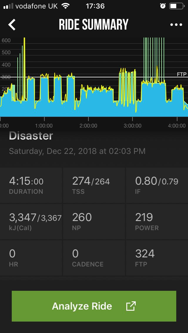 Personally I think itâs significantly harder that an outdoor ride of the same distance. The relentless nature of the efforts on the turbo (albeit that the rest intervals are a decent length in Disaster) are very different from outdoors. On a ride of that length outdoors I would typically have a significant number of zeros when it comes to power numbers.